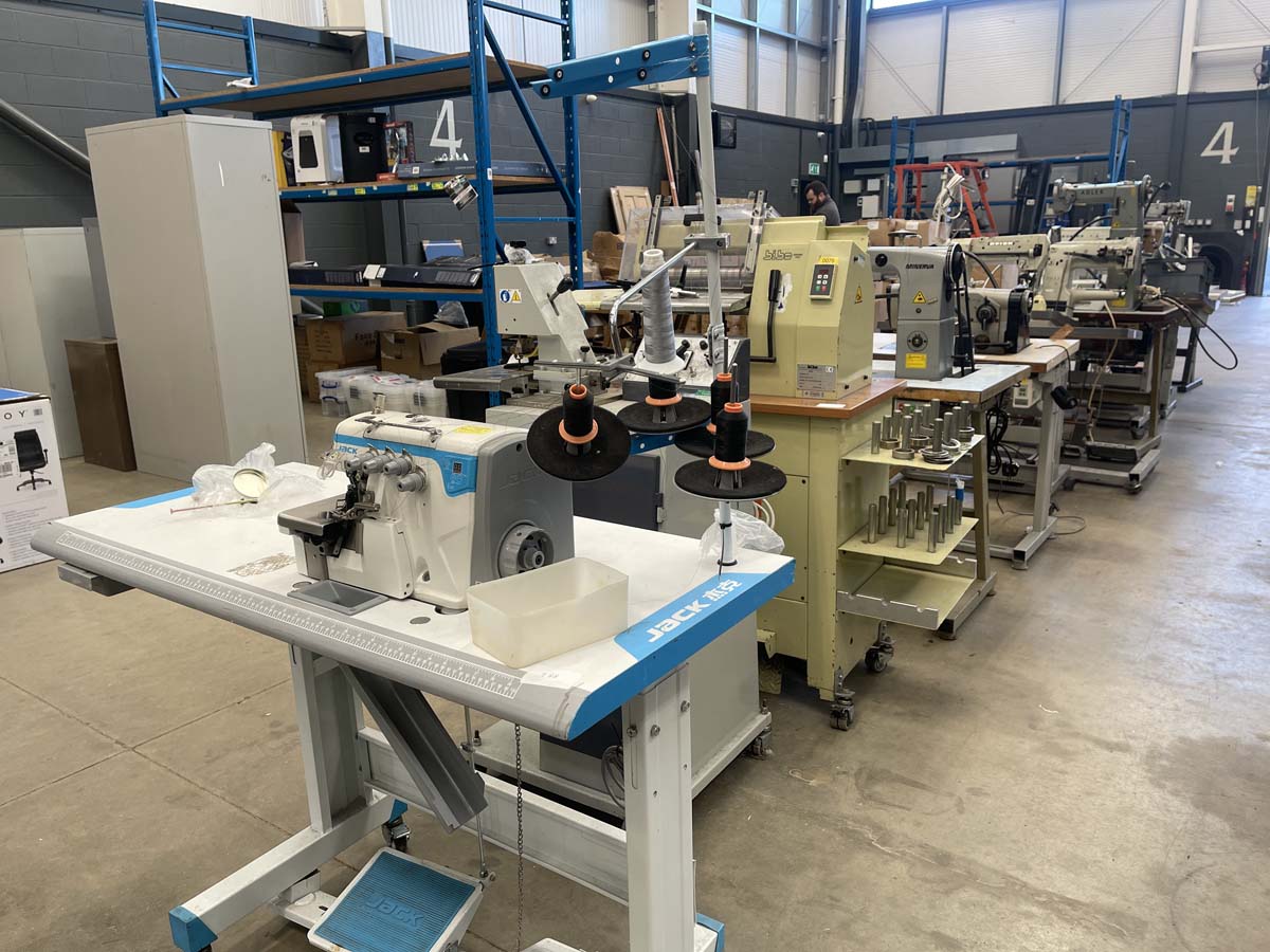 Jack 4 thread overlocker; Flat bed single needle sewing machines by Benina, Adler & others; Heavy duty industrial post sewing machines by Seiko (PWB- 8GWI), Adler, Durkopp Adler & Minerva; Bibo TSL 300v slitting cutter (2007); Bibo RL500 linear folding machines (2013), etc