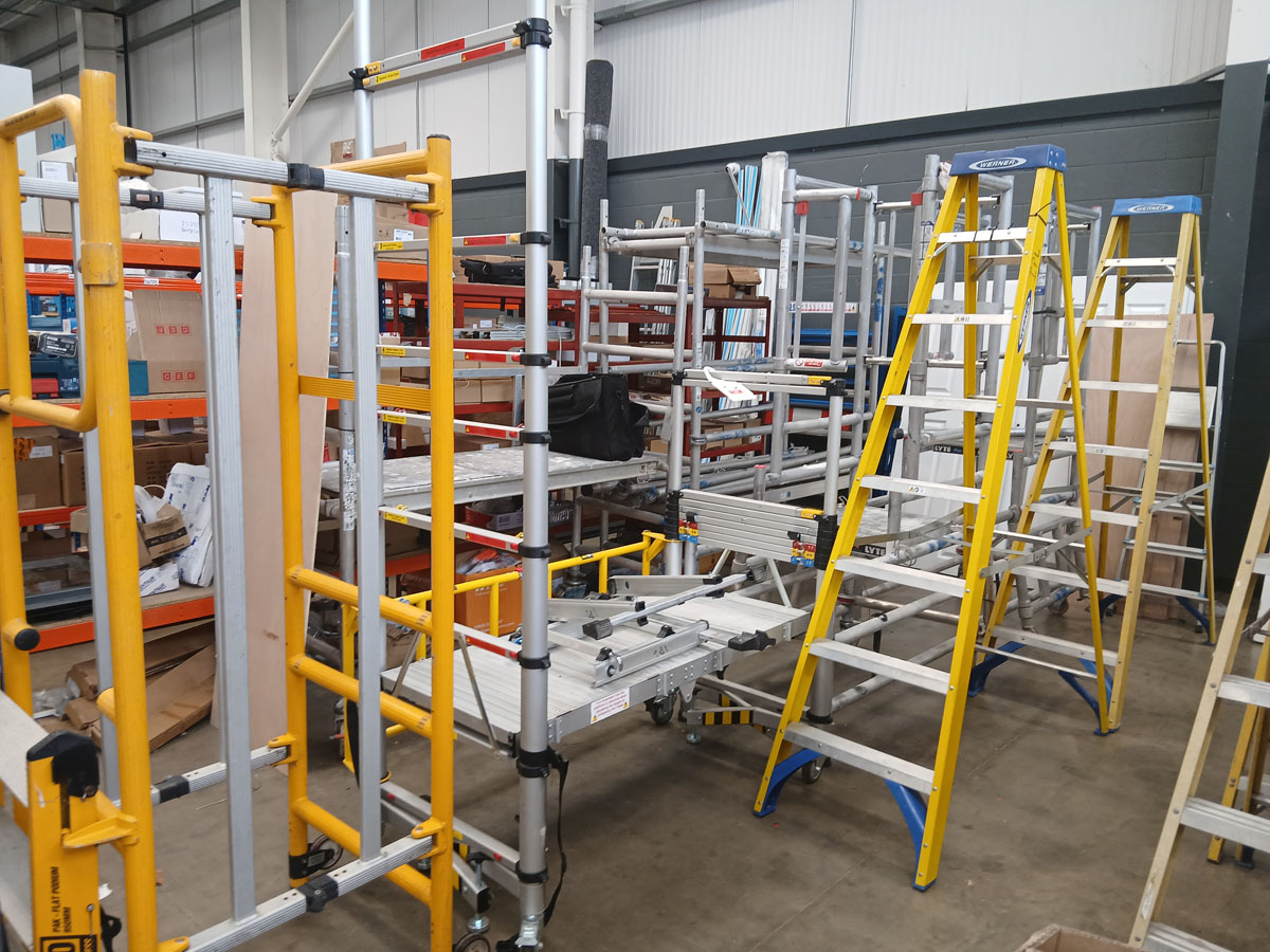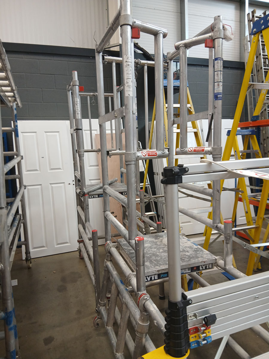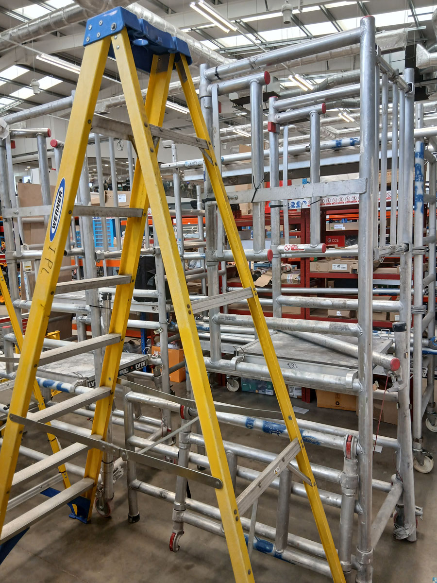 Aluminium scaffold tower work platform with associated fittings; 2 x Lyte aluminium work platform podiums; Yellow work podium; 2 x aluminium telescopic ladders; 2 x triple extending ladders; Various sized Werner electricians step ladders; Extend Climb telescopic ladder