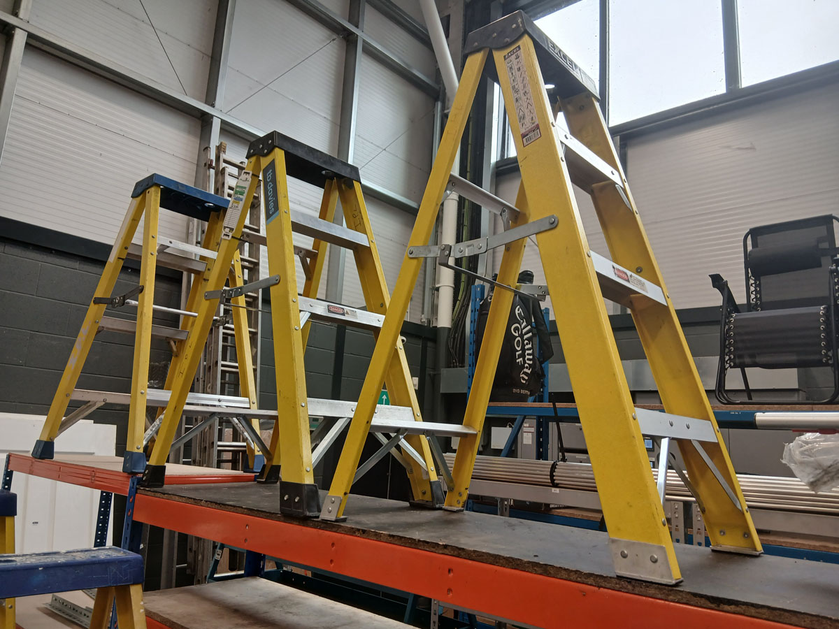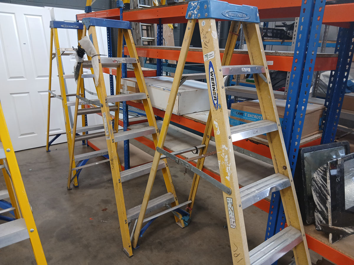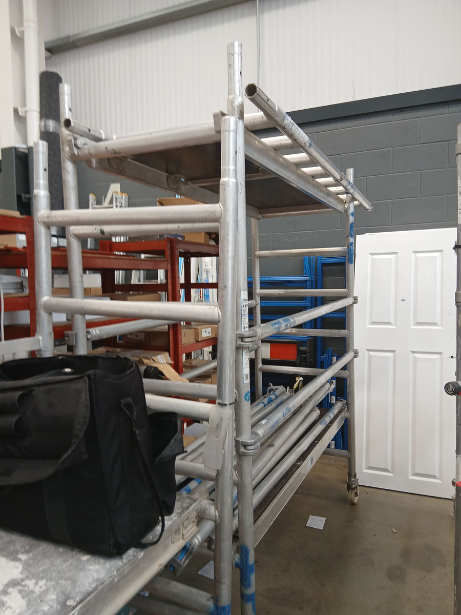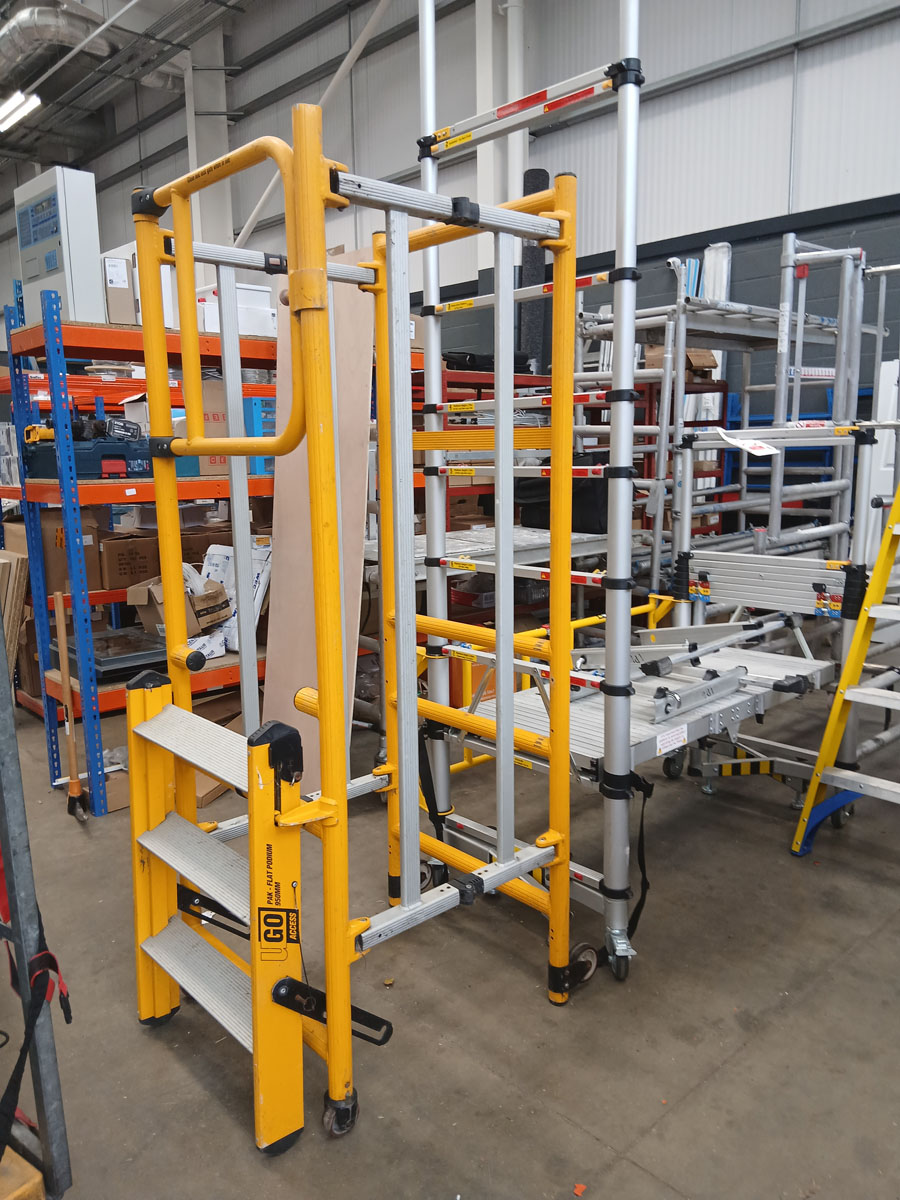 Aluminium scaffold tower work platform with associated fittings; 2 x Lyte aluminium work platform podiums; Yellow work podium; 2 x aluminium telescopic ladders; 2 x triple extending ladders; Various sized Werner electricians step ladders; Extend Climb telescopic ladder