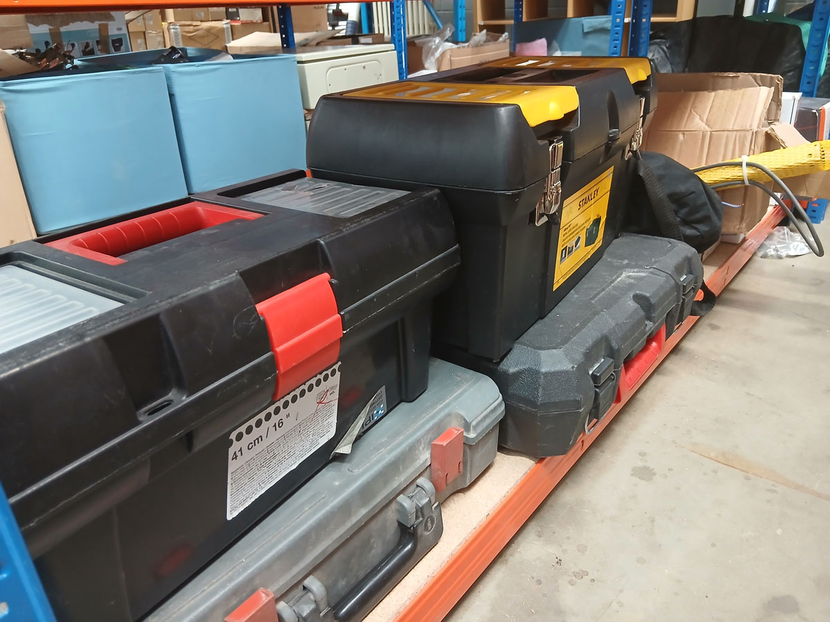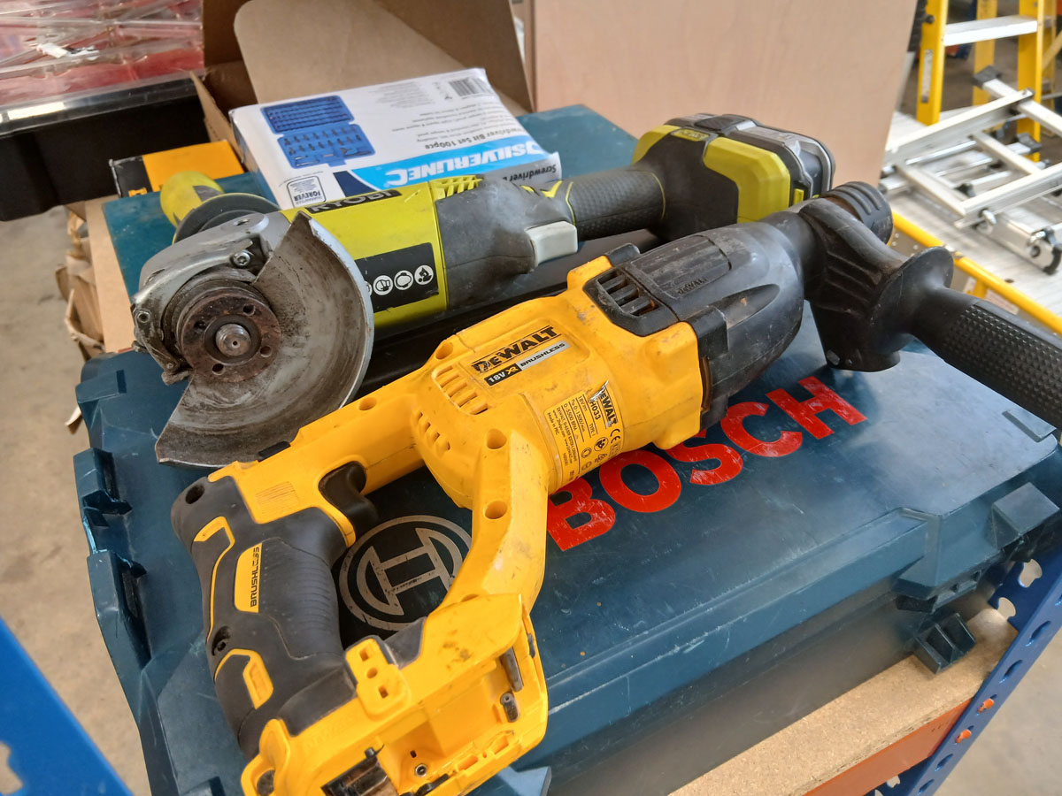 Ryobi 18v cordless angle grinder; Dewalt 18v cordless drill; Makita 110v angle grinder; Distance measuring wheel; Makita 18v cordless drill/driver in case; Bosch 18v cordless h/d SDS drill; Bosch GBII 2-24 DSR 110v SDS drill; 2 x cases of various tools including Brecknell scales; Sets of JSP safety harnesses; 110v transformer