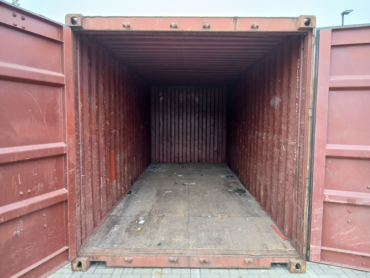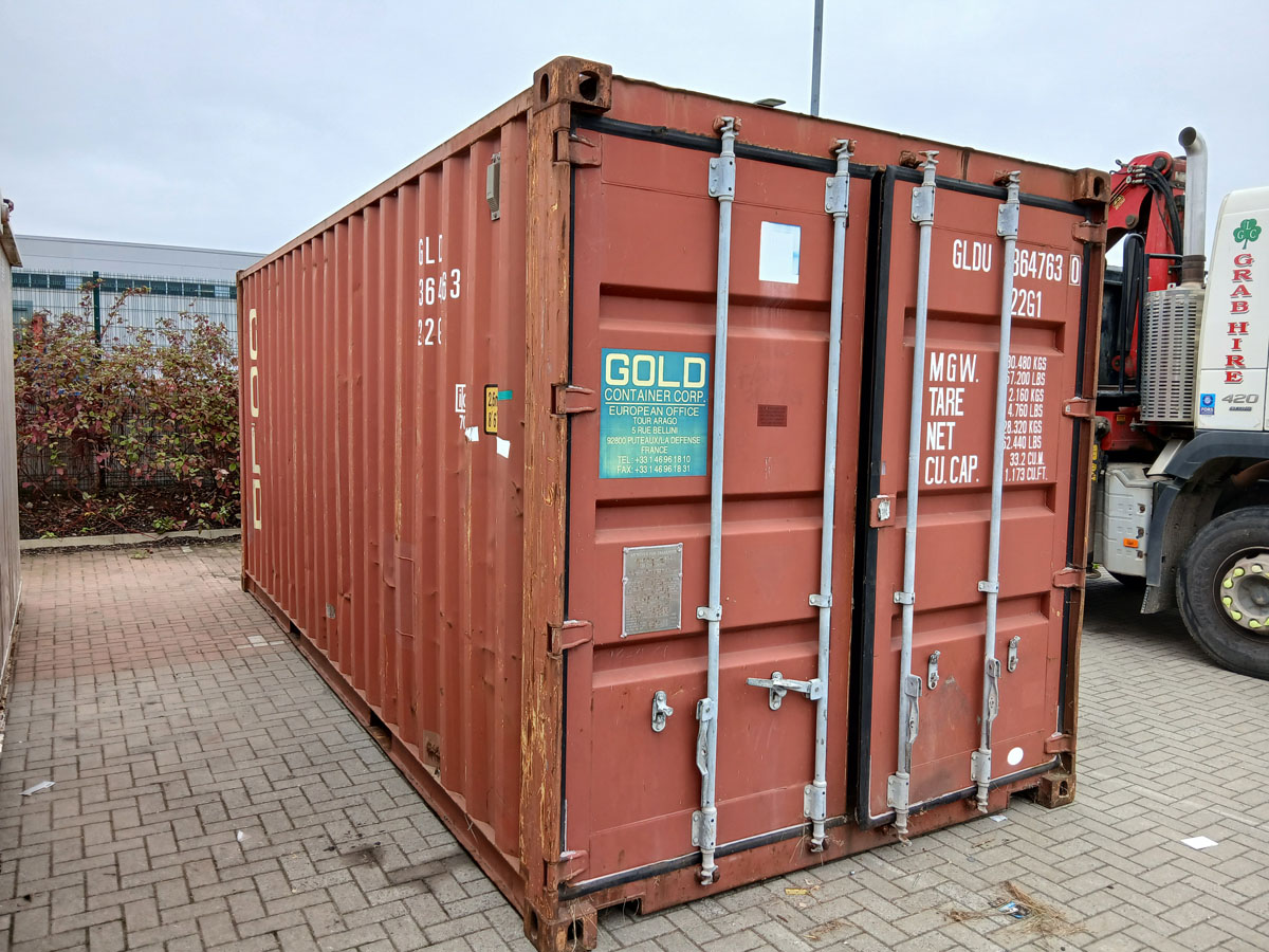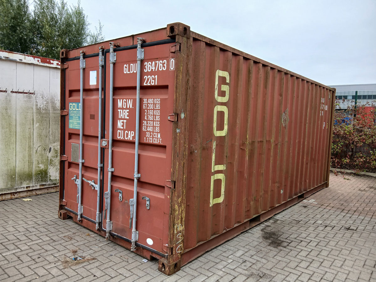 20ft x 8ft corrugated steel shipping storage container with a pair of end opening doors and interior plywood flooring