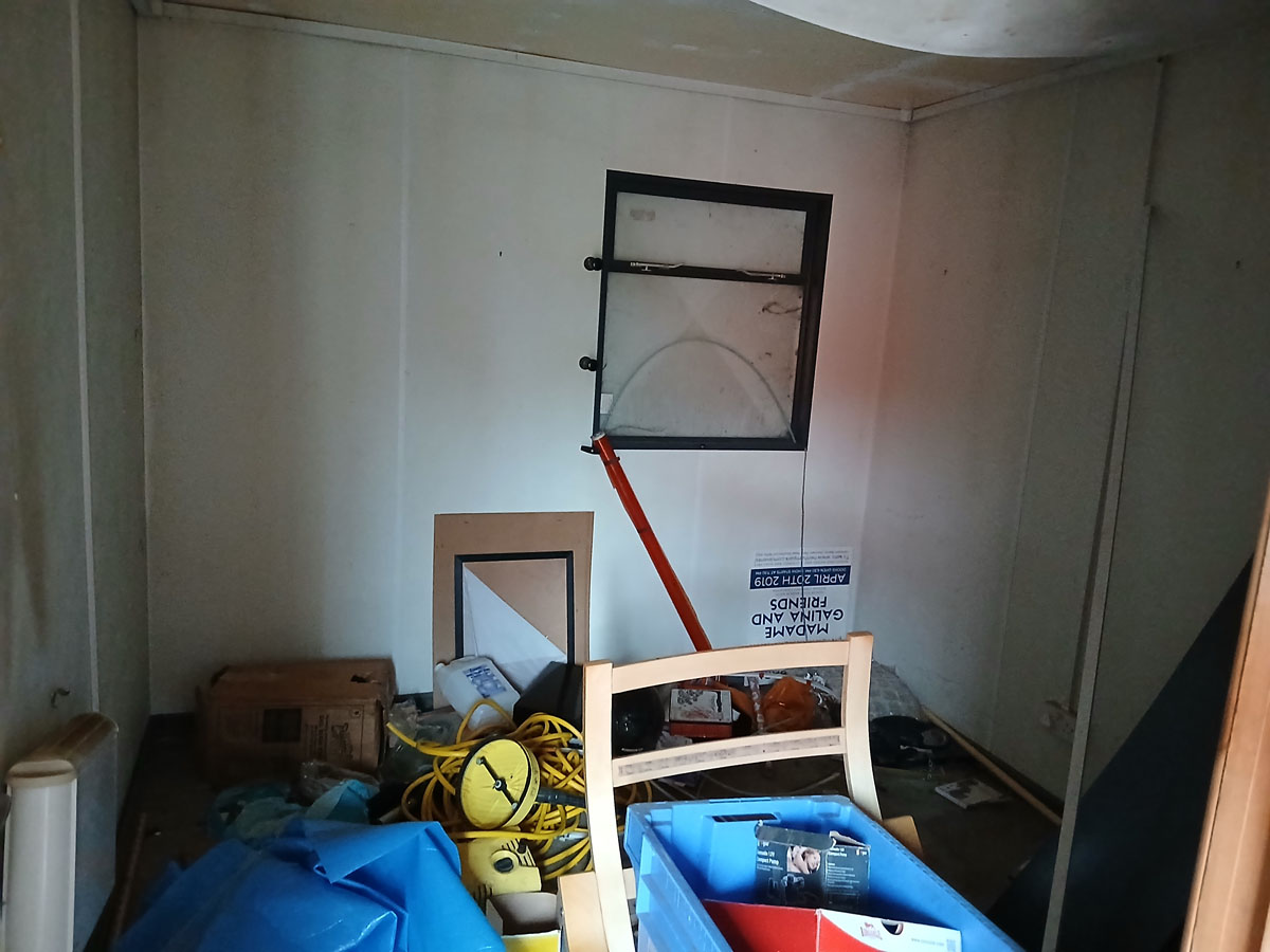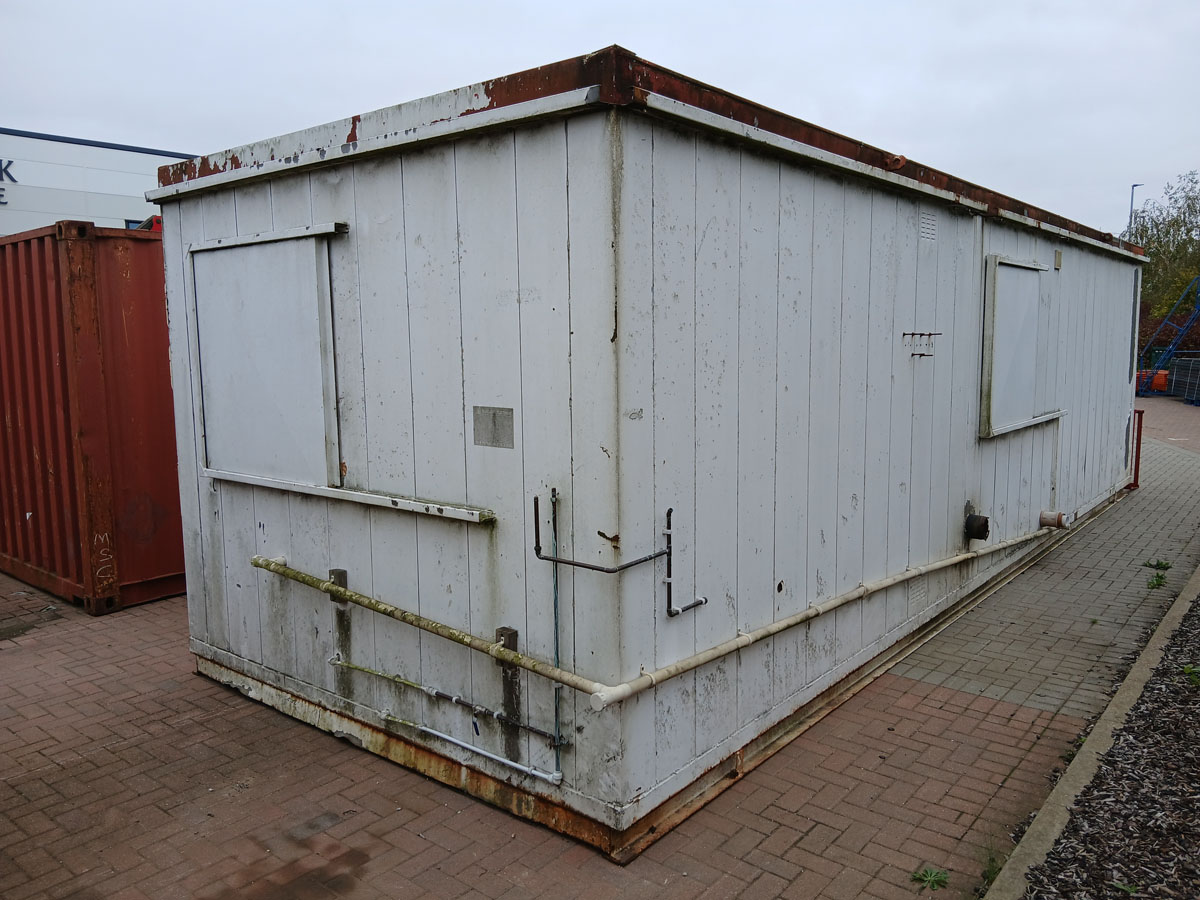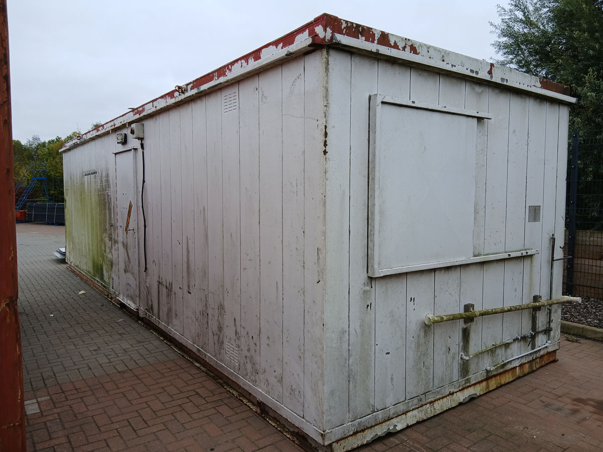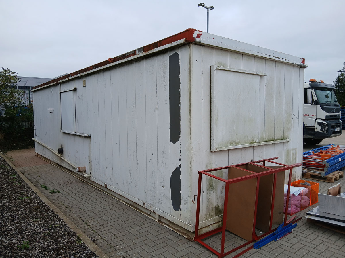 30ft x 10ft metal clad site office with 2 internal rooms (office and kitchen areas) plus central WC cubical. Fitted with internal electric cabling to switches and lights. With 3 security shuttered windows and single pedestrian door