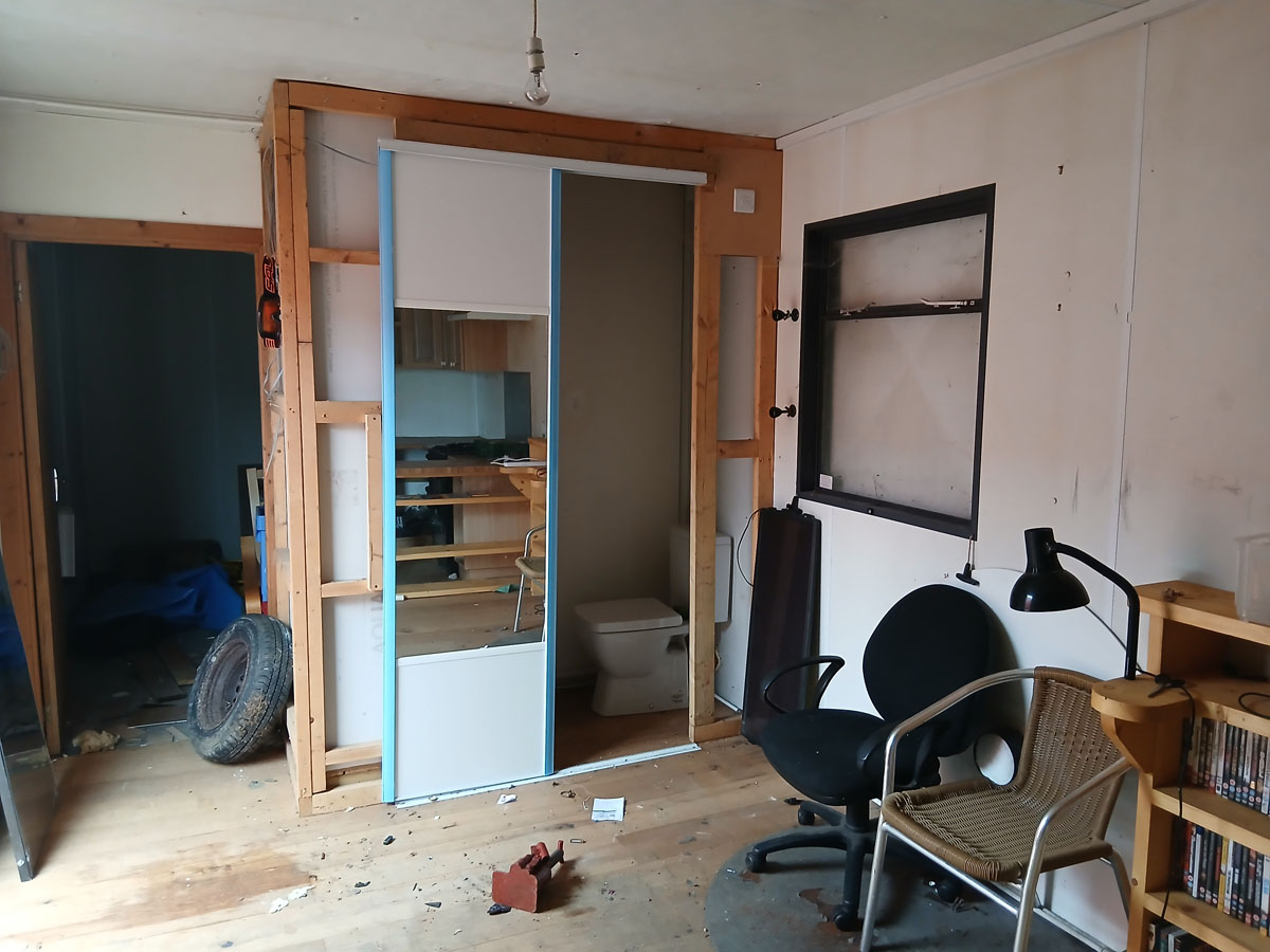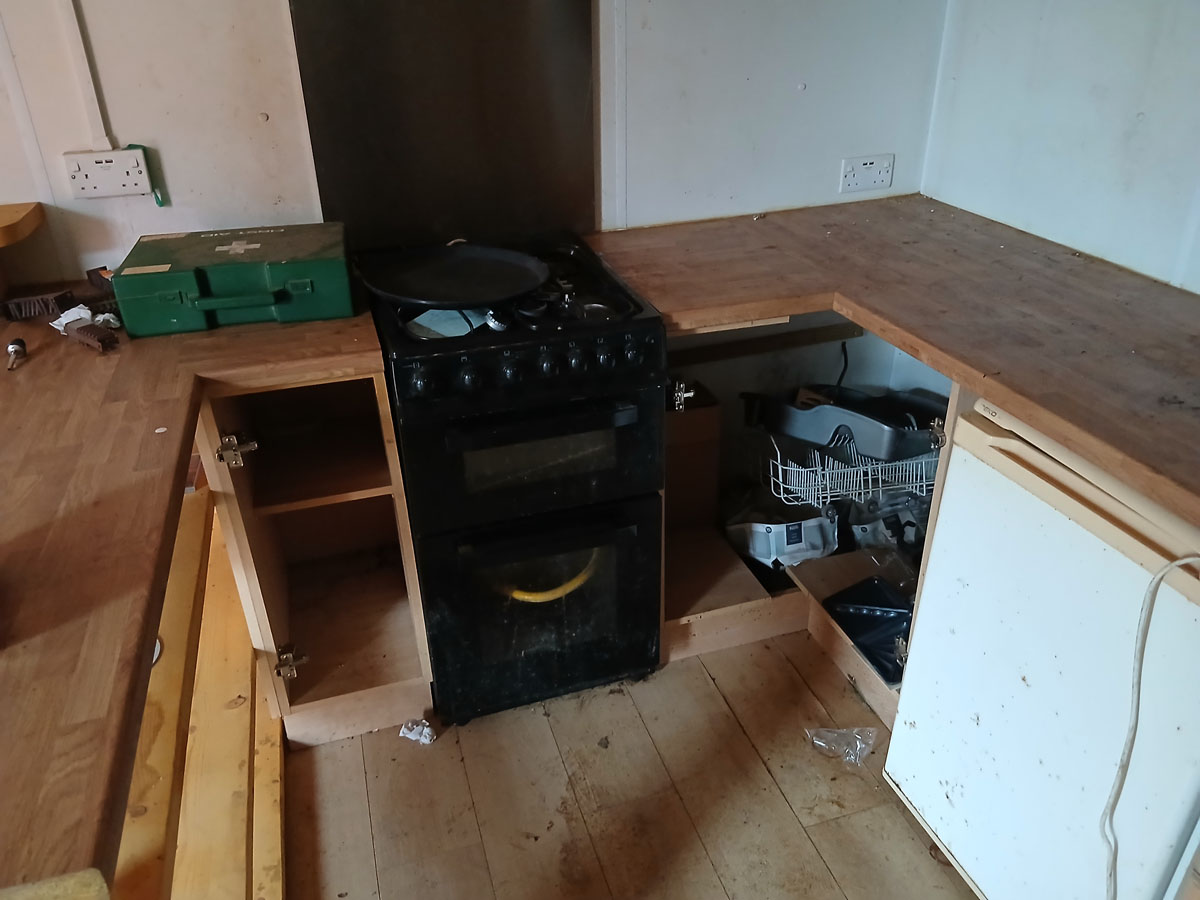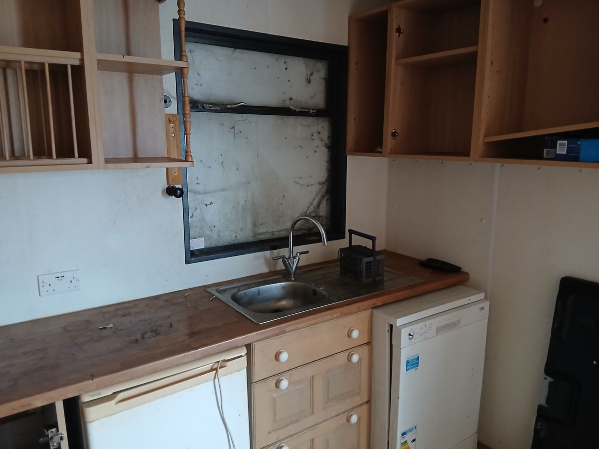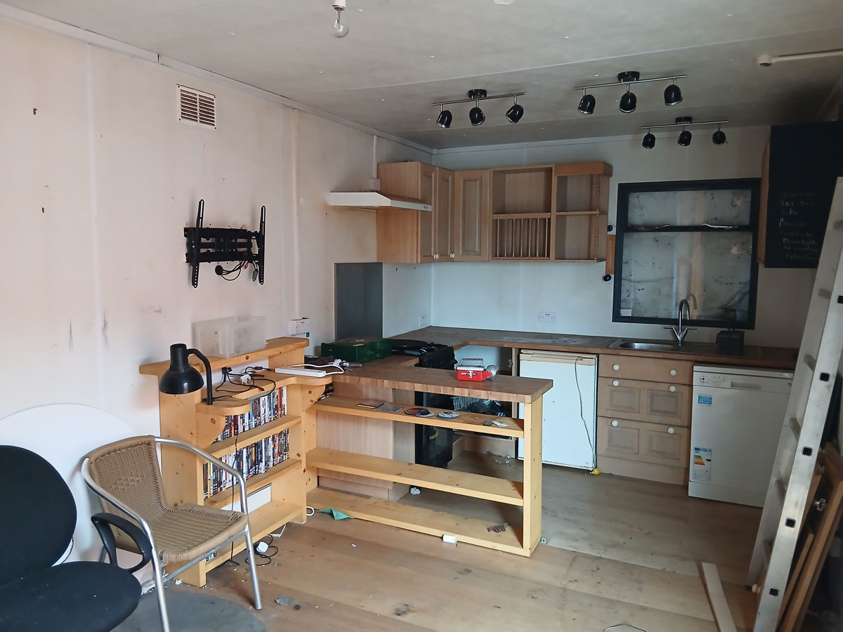 30ft x 10ft metal clad site office with 2 internal rooms (office and kitchen areas) plus central WC cubical. Fitted with internal electric cabling to switches and lights. With 3 security shuttered windows and single pedestrian door